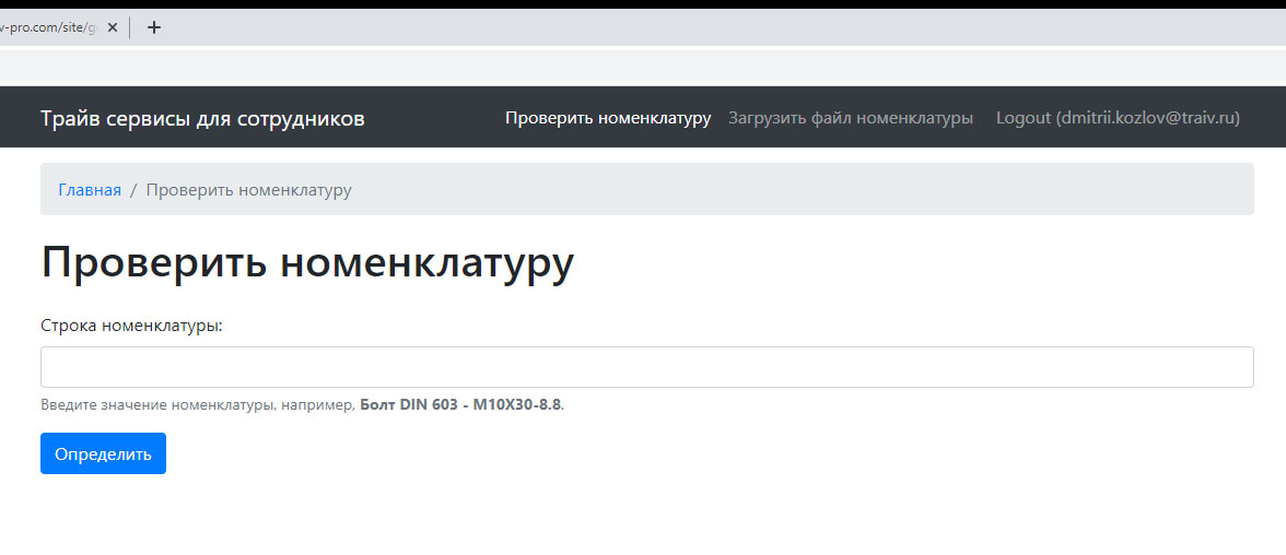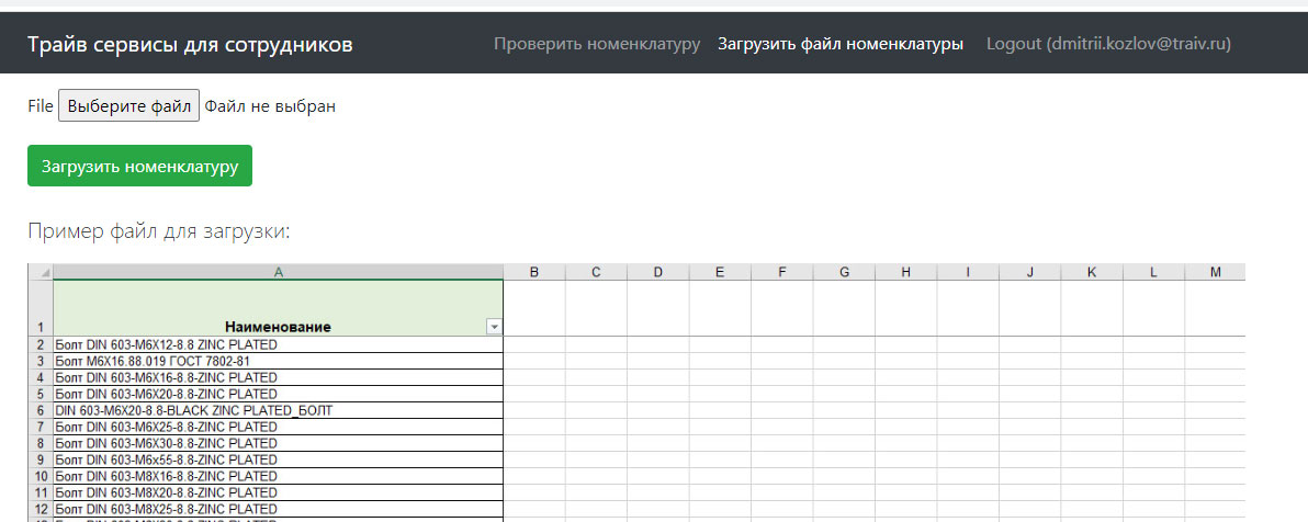 Для пакетного разбора номенклатуры, необходимо воспользоваться разделом Загрузить файл номенклатуры (https://local.traiv-pro.com/upload/) В данном случае предполагается, что в систему будет загружен файл со списком строк номенклатуры, на выходе вы получаете список этих же строк с дополненными данными. Выберите файл у себя на компьютере в формате, представленном в примере и нажмите кнопку загрузить номенклатуру. В ответ браузер предложит скачать измененный файл номенклатуры.