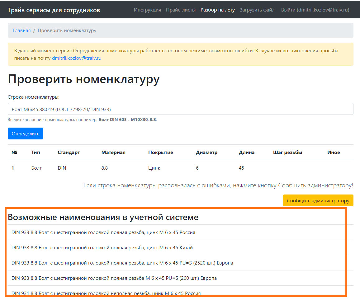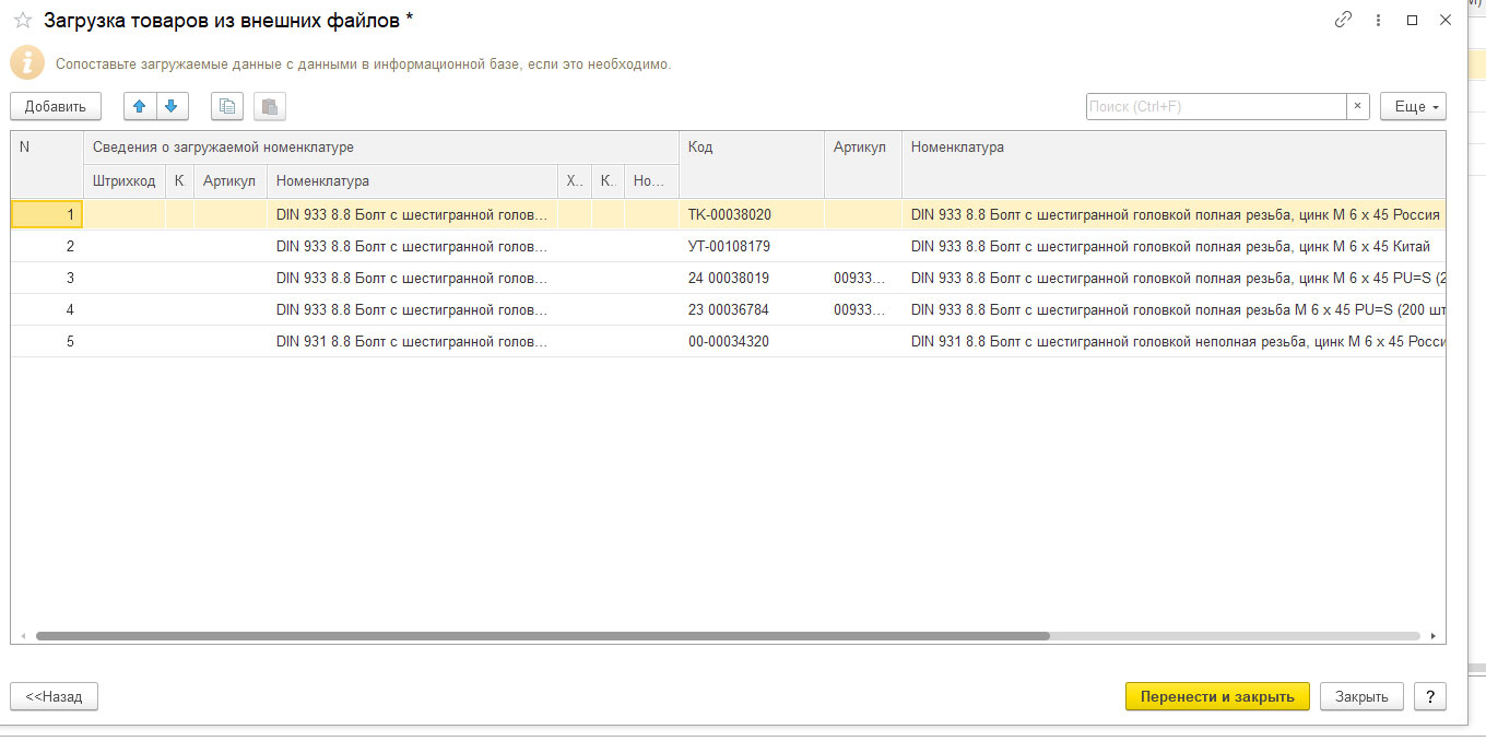 В результате вы получите распознанную номенклатуру по параметрам и возможные соответствия позиции из нашей учетной системы.