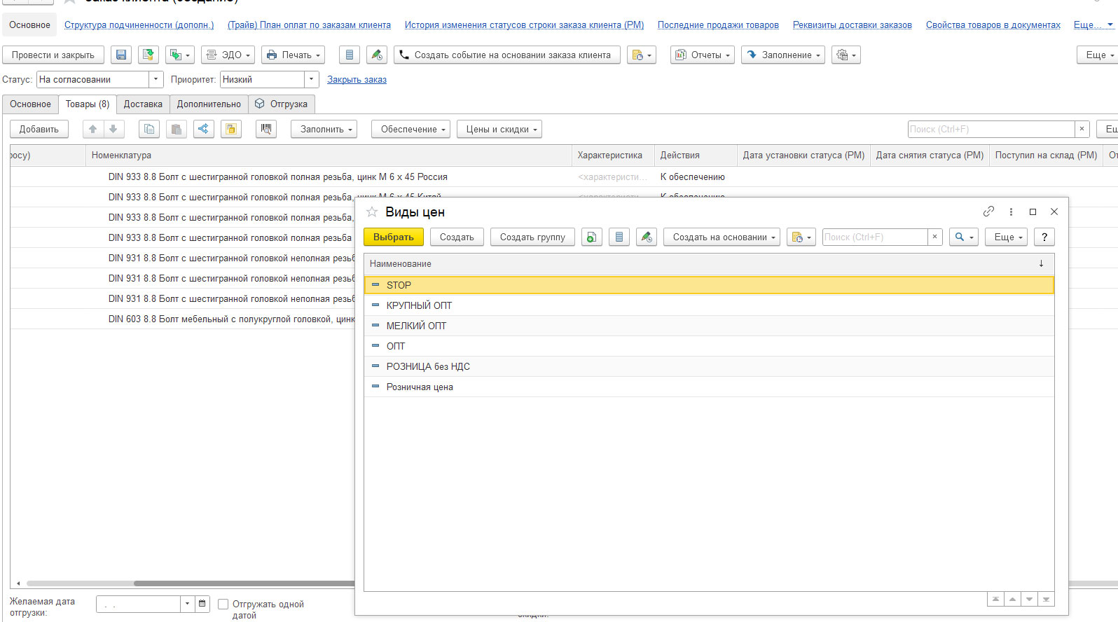 Затем можно будет заполнить выбранную номенклатуру Ценами или выставив для каждой позиции нужный тип Цены или заполним цены массово путем выбора в меню Цены и скидки пункт – Цены по виду цен.