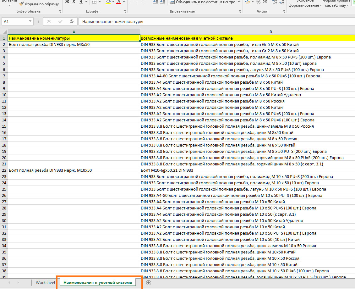 Далее нужно скопировать список позиций из области Возможные наименования в учетной системе в таблицу 1С: